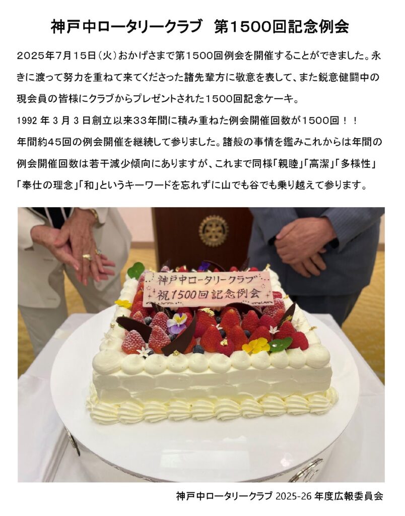 第1500回記念例会開催 2025.07.25未分類 未分類 第1500回記念例会開催 関連記事一覧 在ホーチミン元日本留学生クラブへの支援 ひょうご五国+ワールドフェスタについて 7月31日(火)例会は8月4日(土)へ移動 RID2680 神戸第2グループのロータリークラブの皆様 2013~2014地区大会プログラム 2010-2011 宇尾会長年度スタート 観桜会 神戸第2グループ Intercity Meetiyng 新会員 田中寿壮会員 入会!